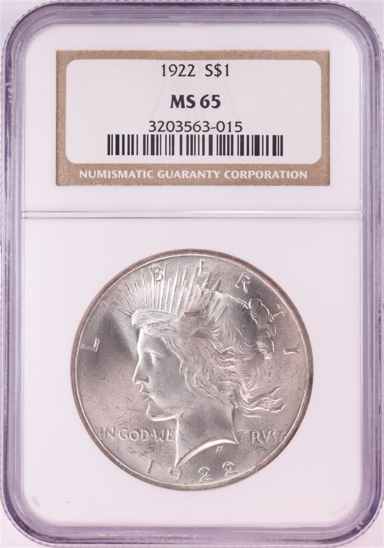 One 1922 $1 Peace Silver Dollar Coin NGC MS65. NGC Certified.