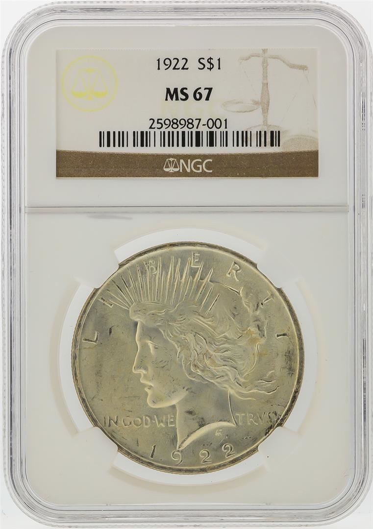 One 1922 $1 Peace Silver Dollar Coin NGC MS67. NGC Certified.