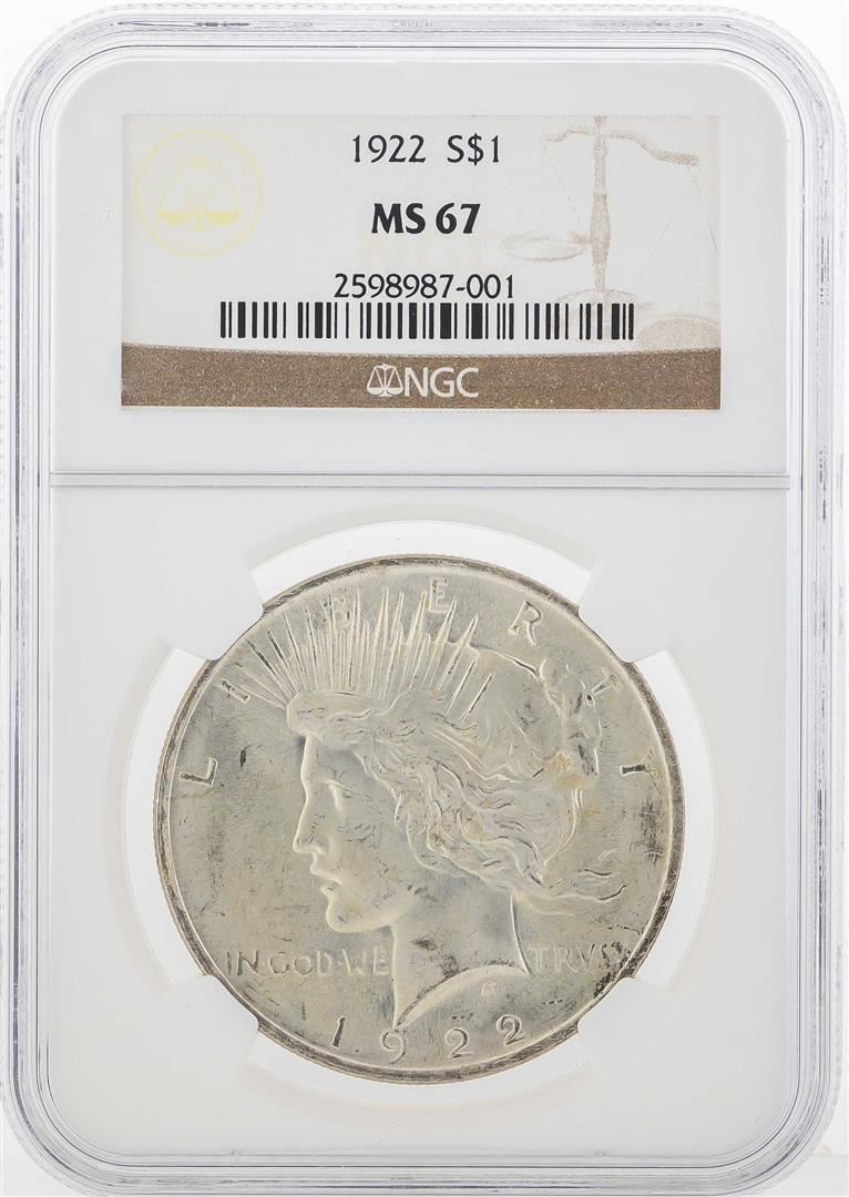 One 1922 $1 Peace Silver Dollar Coin NGC MS67. NGC Certified.