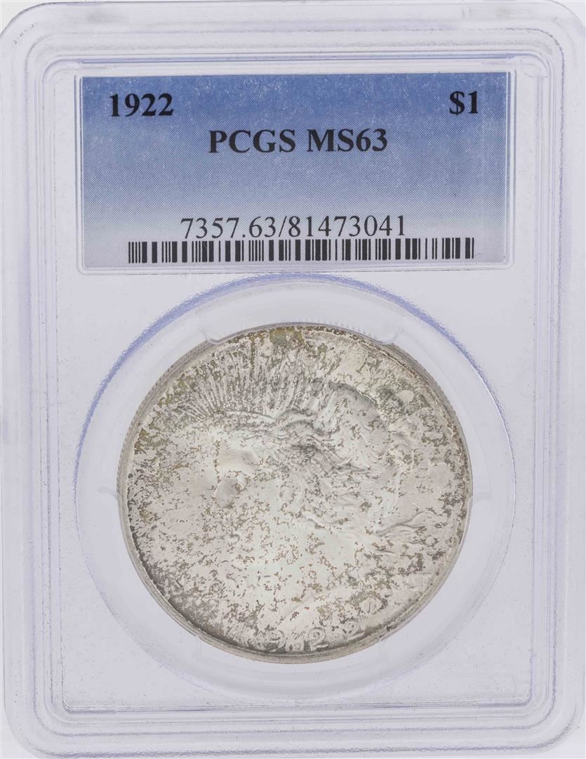 One 1922 $1 Peace Silver Dollar Coin PCGS MS63. PCGS Graded.