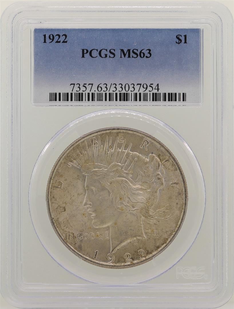 One 1922 $1 Peace Silver Dollar Coin PCGS MS63. PCGS Graded.
