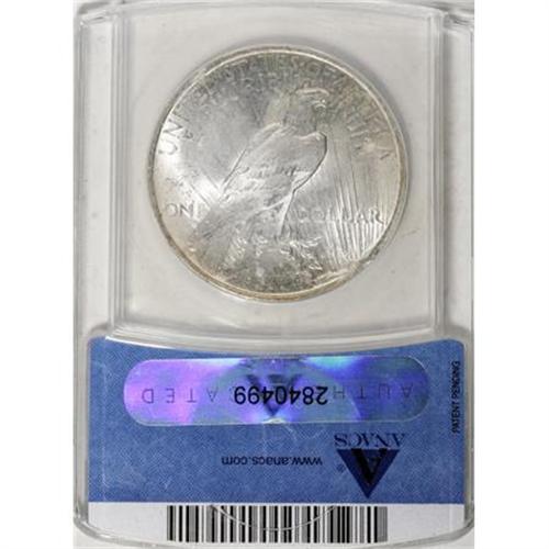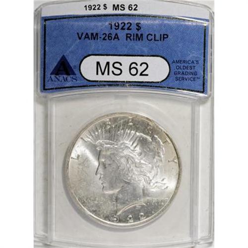 <B>1922 $1 VAM-26A--Rim Clip--MS62 ANACS.</B></I> Reminiscent of the VAM-2E 1922 and VAM-1E 1923 "Wing Break" varieties, the present Peace dollar has a slender die break on the wing near the right (facing) shoulder. A small rim clip at 1 o'clock weakens the rim in that area and opposite at 5 o'clock on the reverse. Well struck and lustrous with a hint of gold patina.<BR><BR><B>Coin Engraver:</B> Anthony de Francisci<BR><BR><b>Shipping:</b> Coins & Currency (<a target="_blank" href="http://www.heritageauctions.com/common/shipping.php">view shipping information</a>)