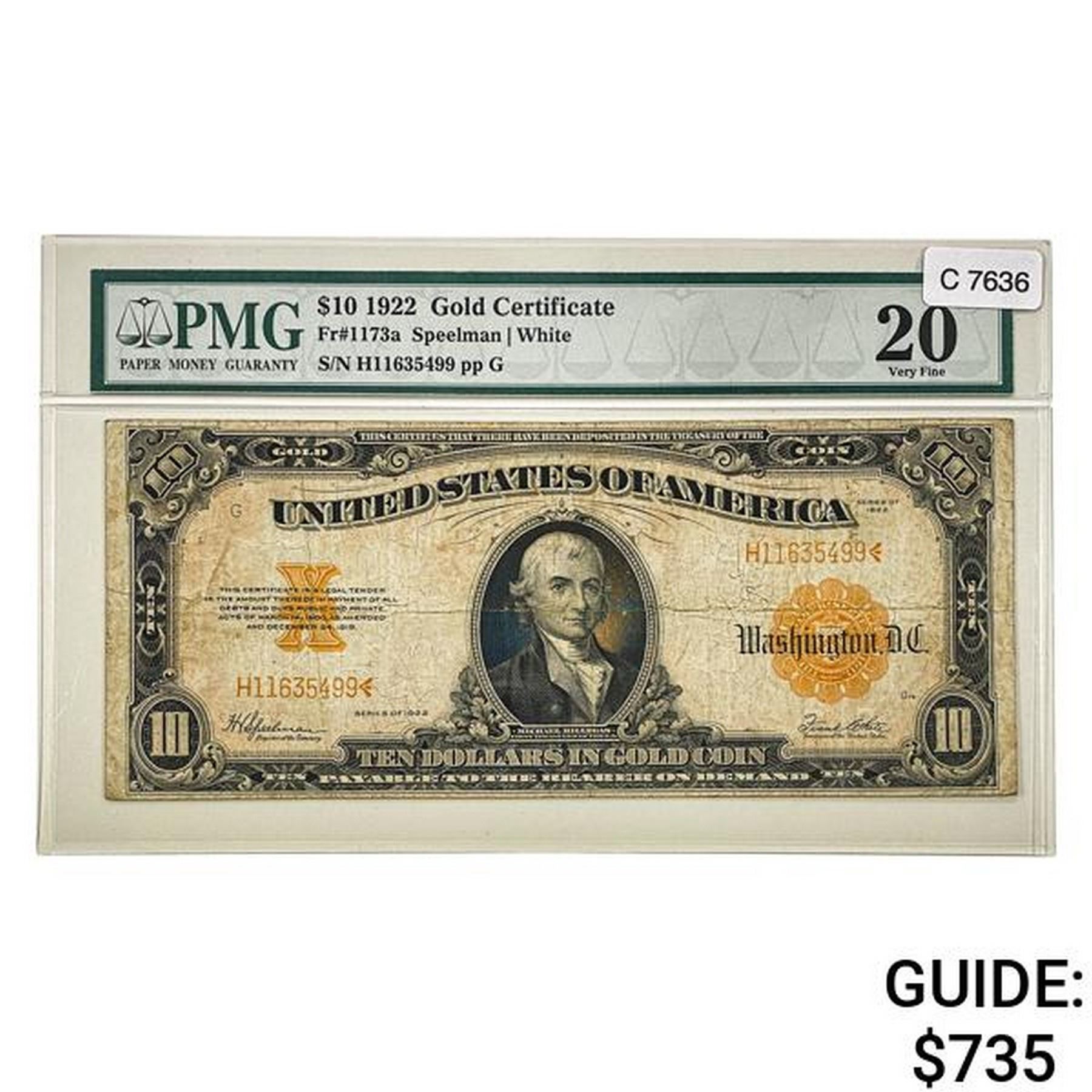1922 $10 GOLD CERTIFICATE PMG VERY FINE-20
