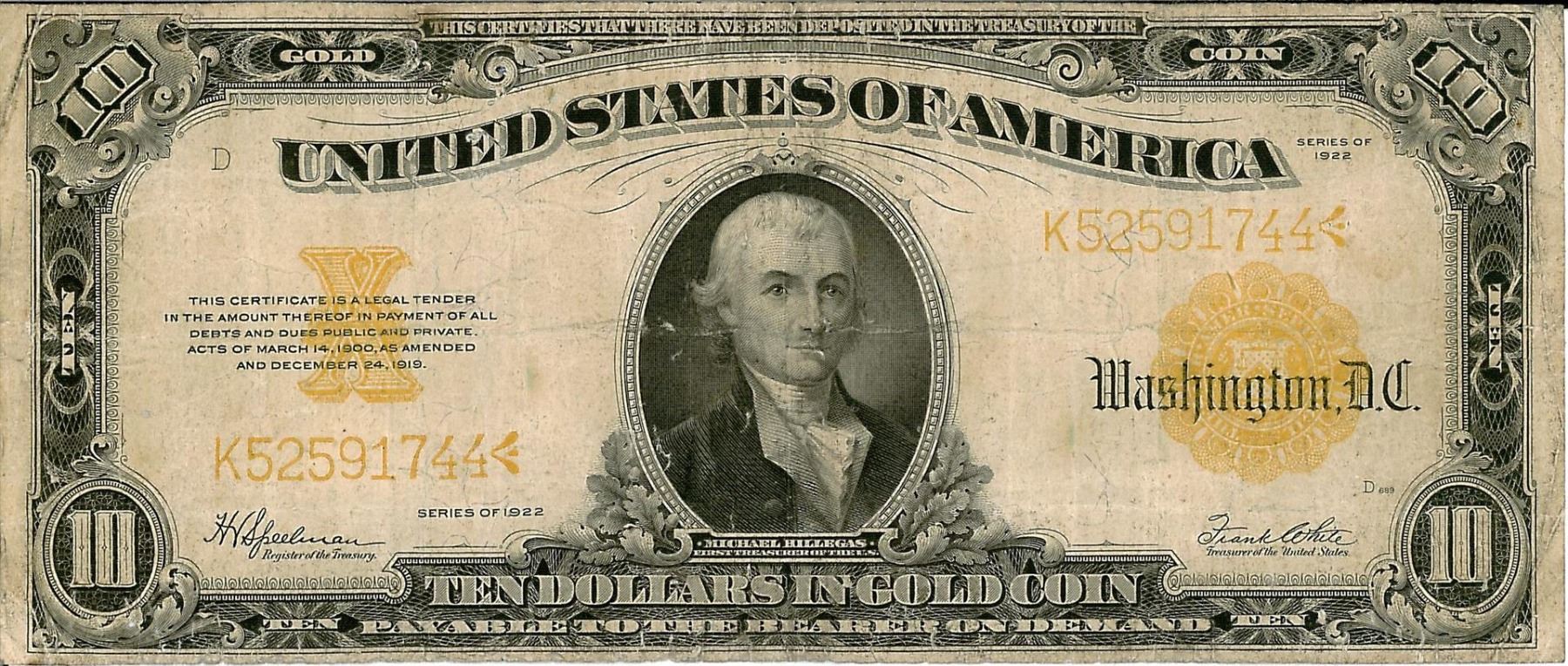 One 1922 $10 Gold Certificate Bank Note. The serial number is 52591744.