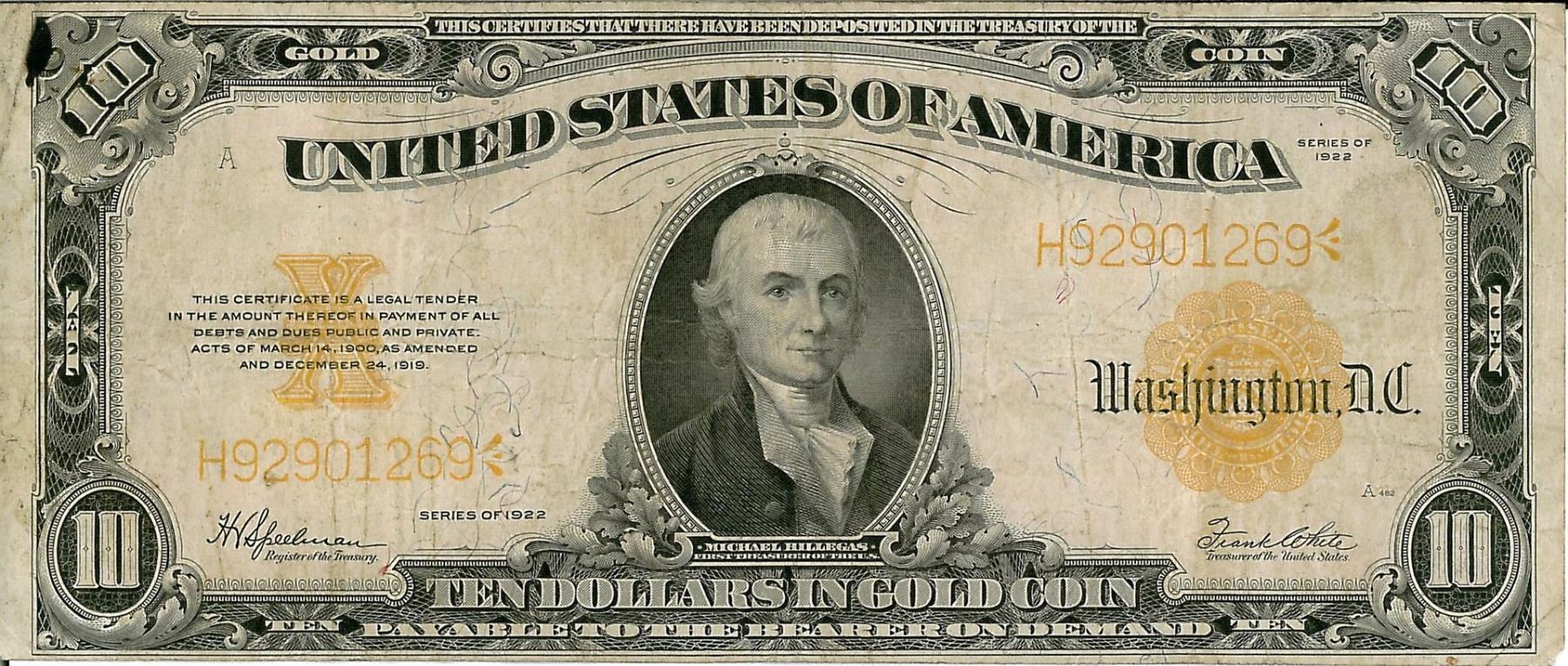 One 1922 $10 Gold Certificate Bank Note. The serial number is 92901269.