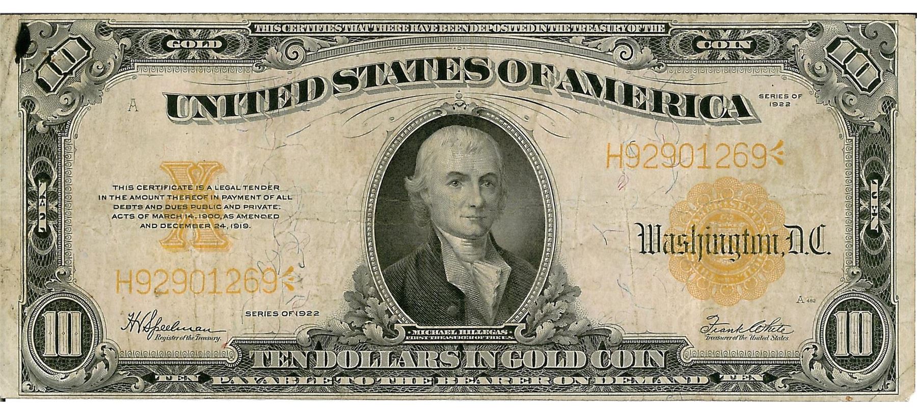 One 1922 $10 Gold Certificate Bank Note. The serial number is 92901269.