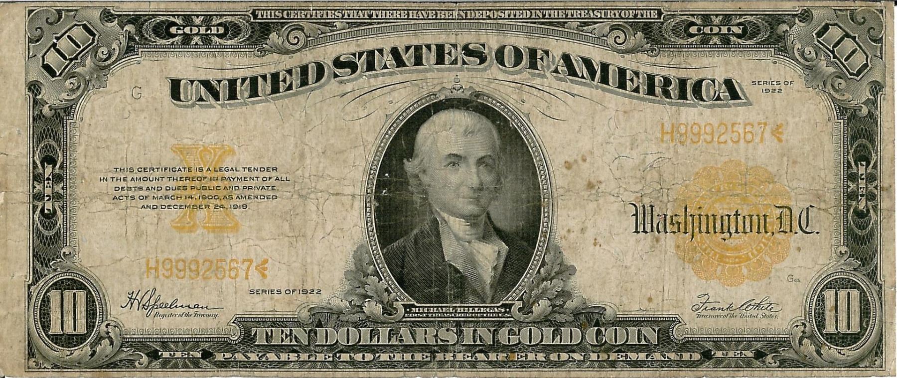 One 1922 $10 Gold Certificate Bank Note. The serial number is 9992567.