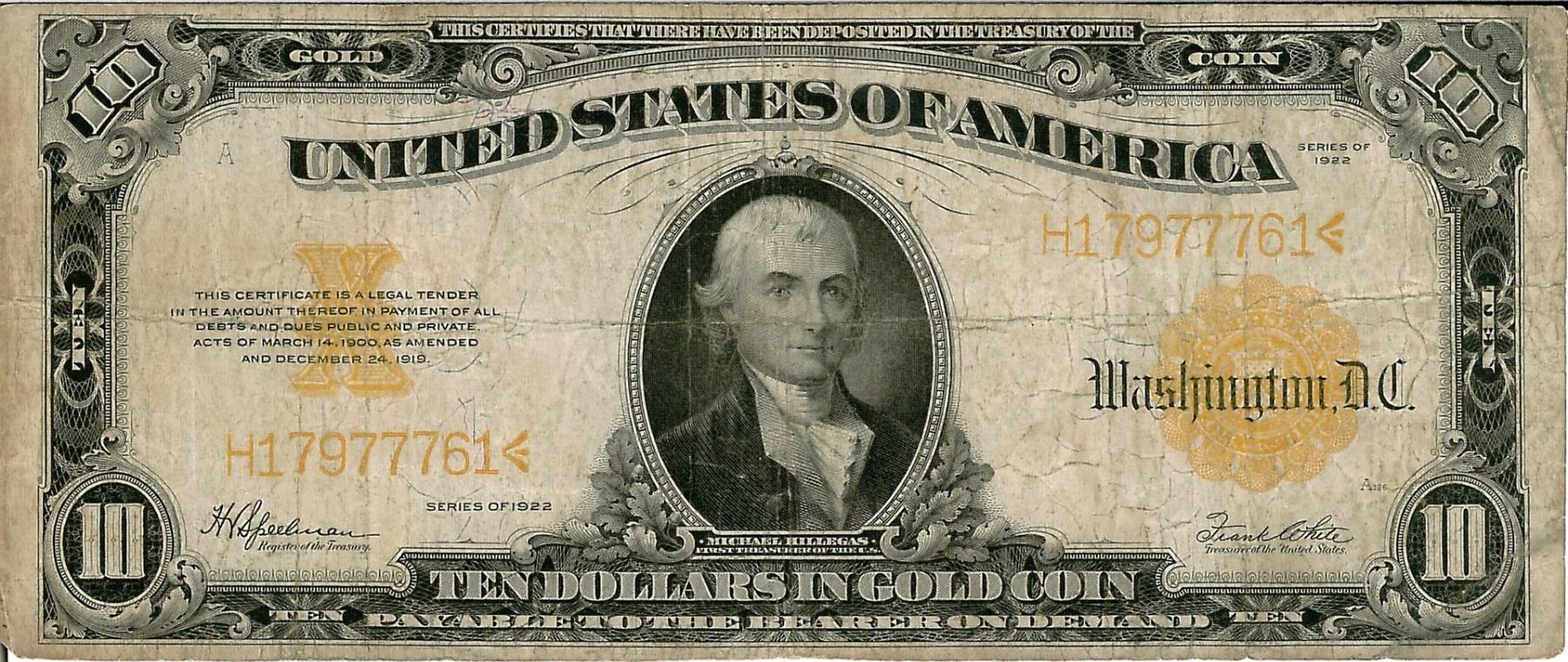 One 1922 $10 Gold Certificate Bank Note. The serial number is 17977761.