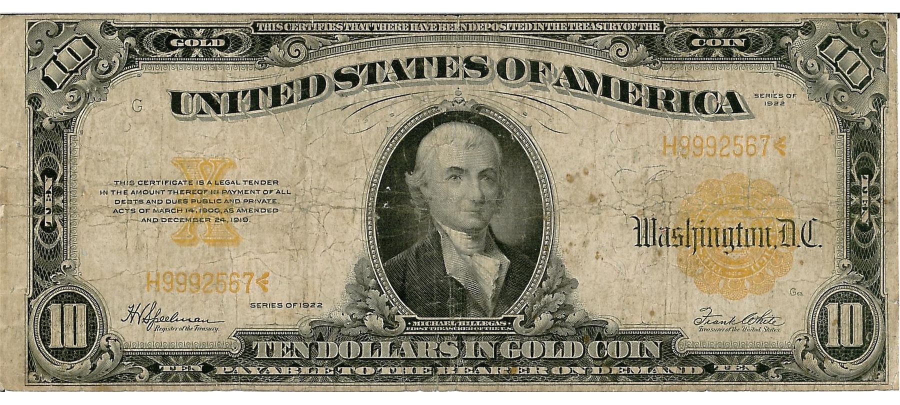 One 1922 $10 Gold Certificate Bank Note. The serial number is 9992567.