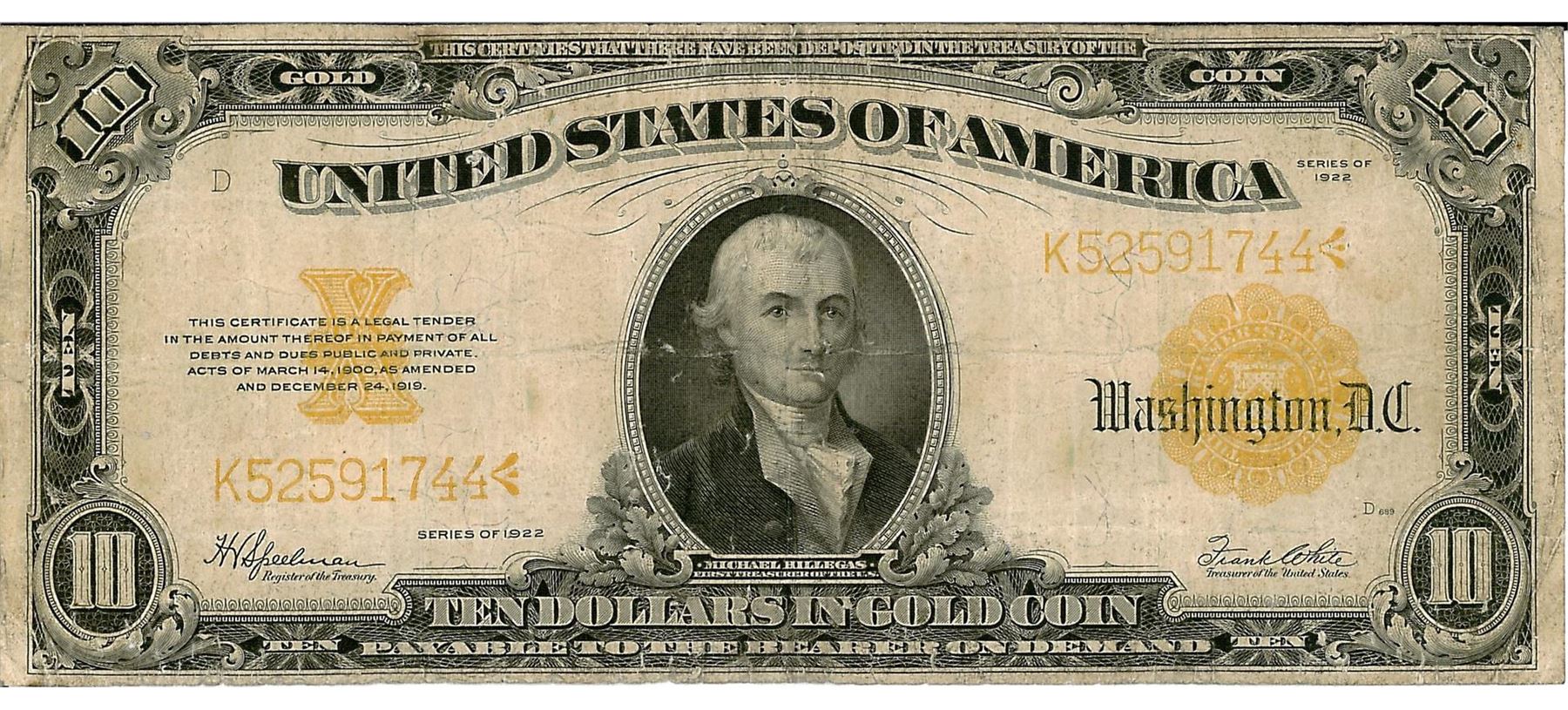 One 1922 $10 Gold Certificate Bank Note. The serial number is 52591744.