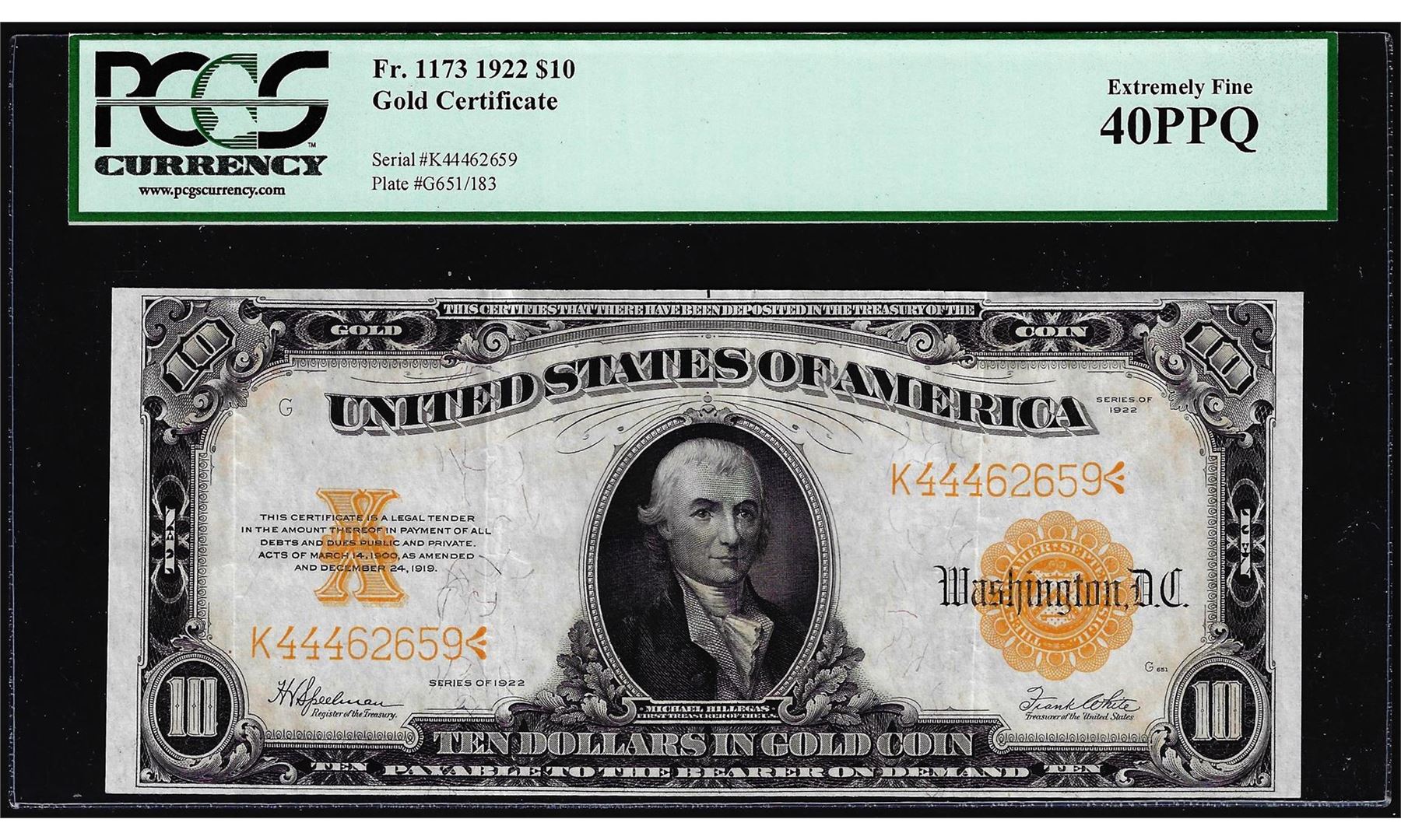 One 1922 $10 Gold Certificate Fr.1173 PCGS Extremely Fine 40PPQ. PCGS Graded.