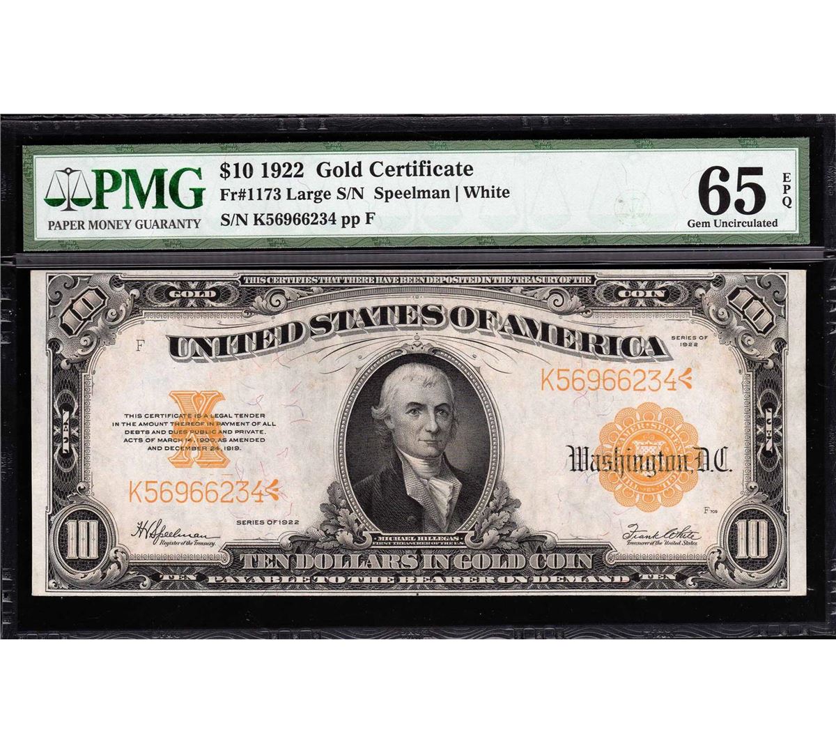 One 1922 $10 Gold Certificate Large Note PMG Gem Uncirculated 65EPQ. PMG Certified.