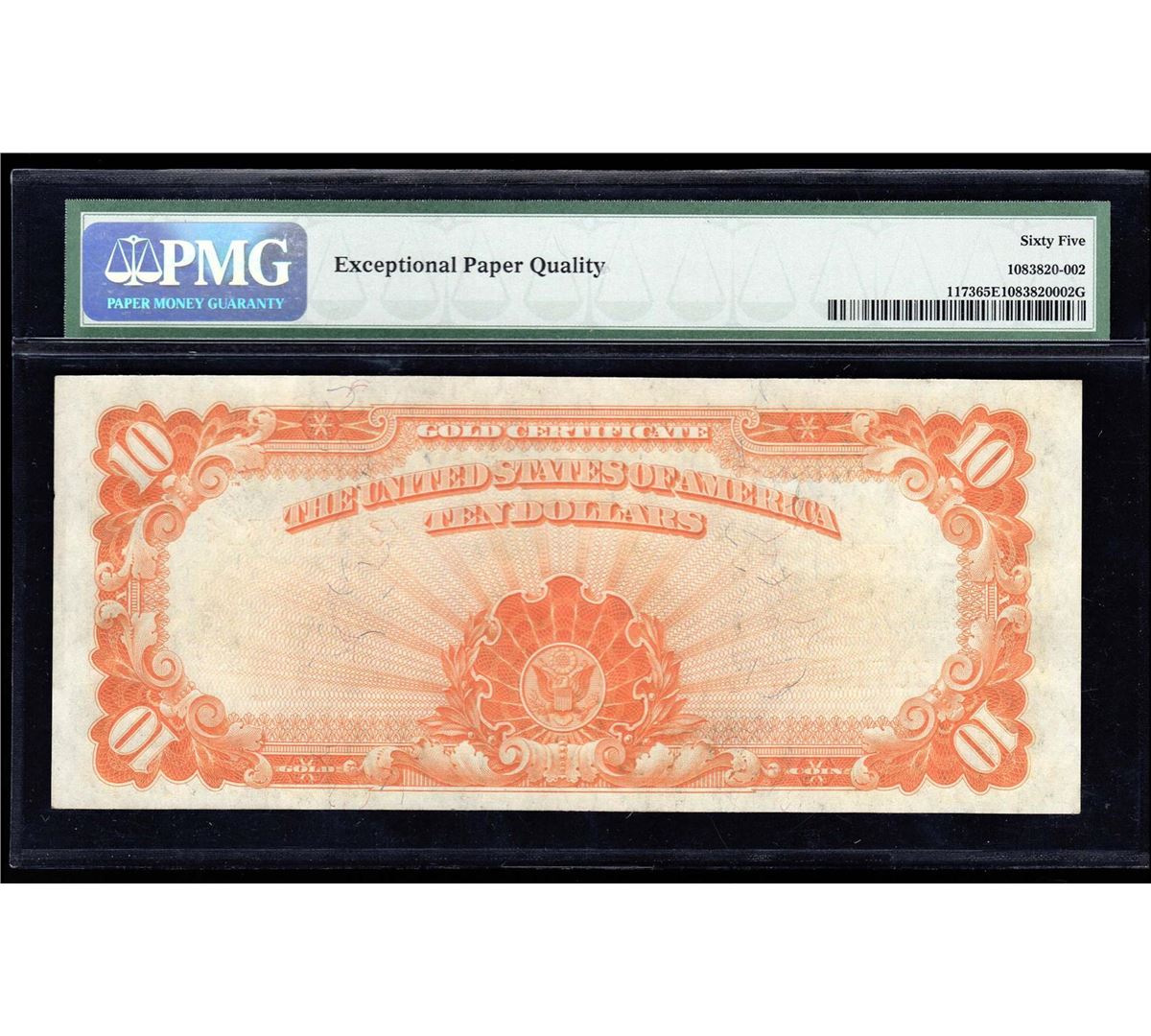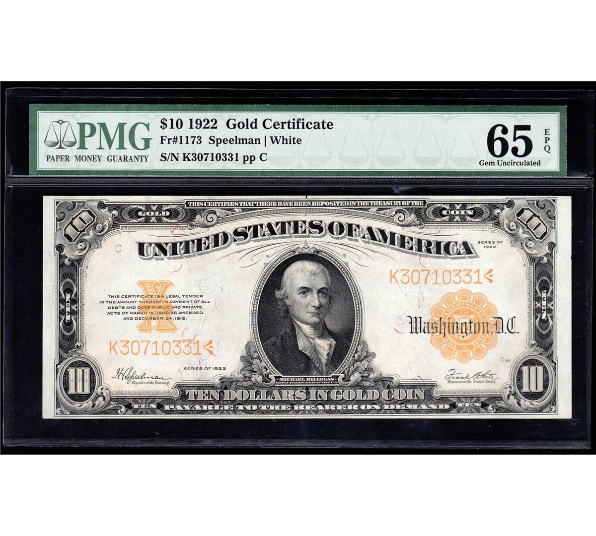 One 1922 $10 Gold Certificate Large Note PMG Gem Uncirculated 65EPQ. PMG Certified.