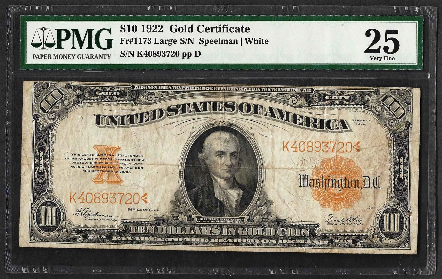 1922 $10 Gold Certificate Note Fr.1173 Large S/N PMG Very Fine 25