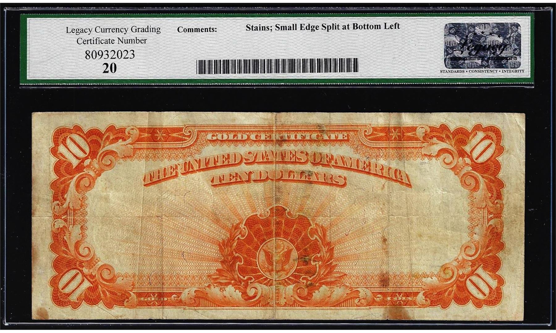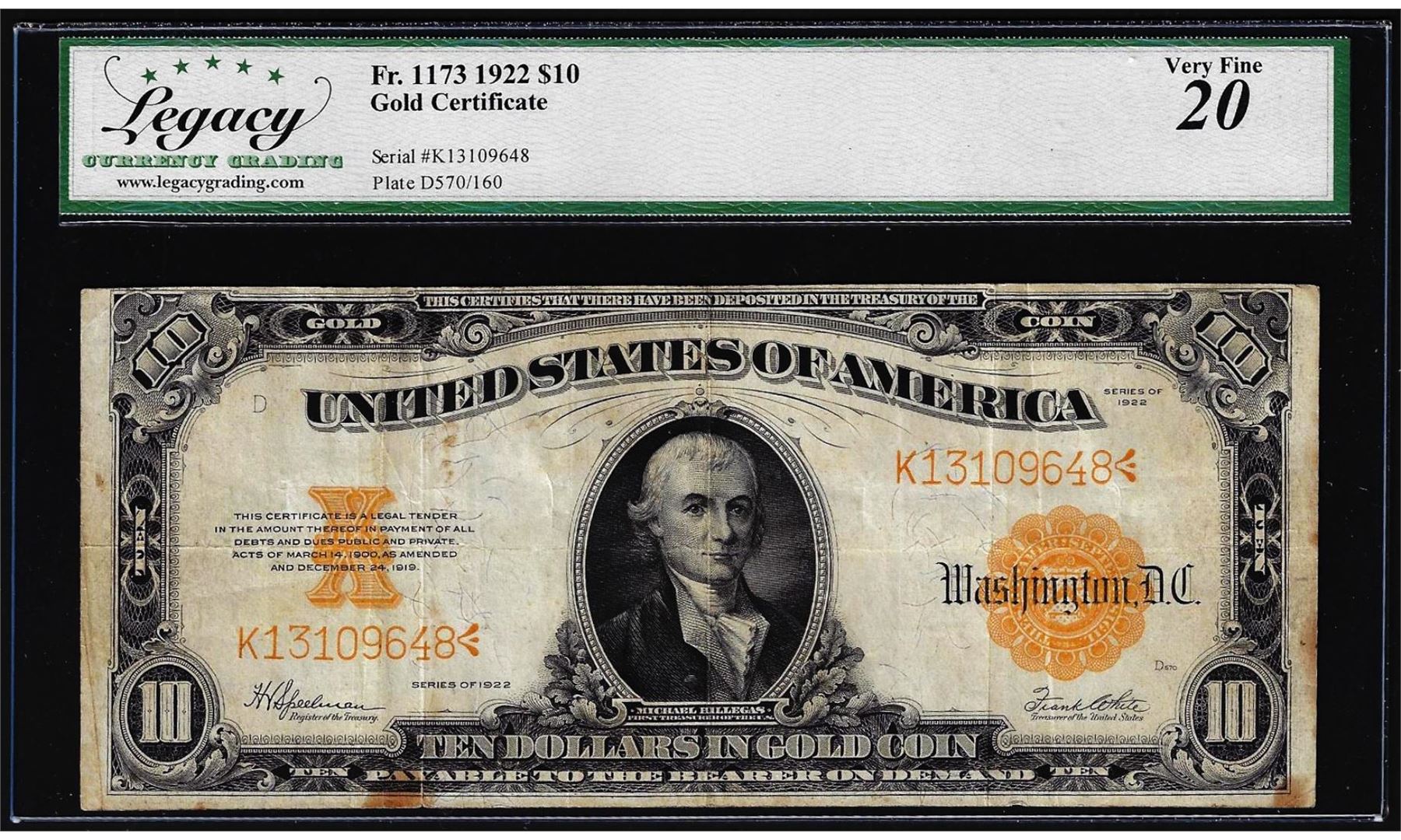 One 1922 $10 Gold Certificate Note Fr.1173 Legacy Very Fine 20. Legacy Graded.