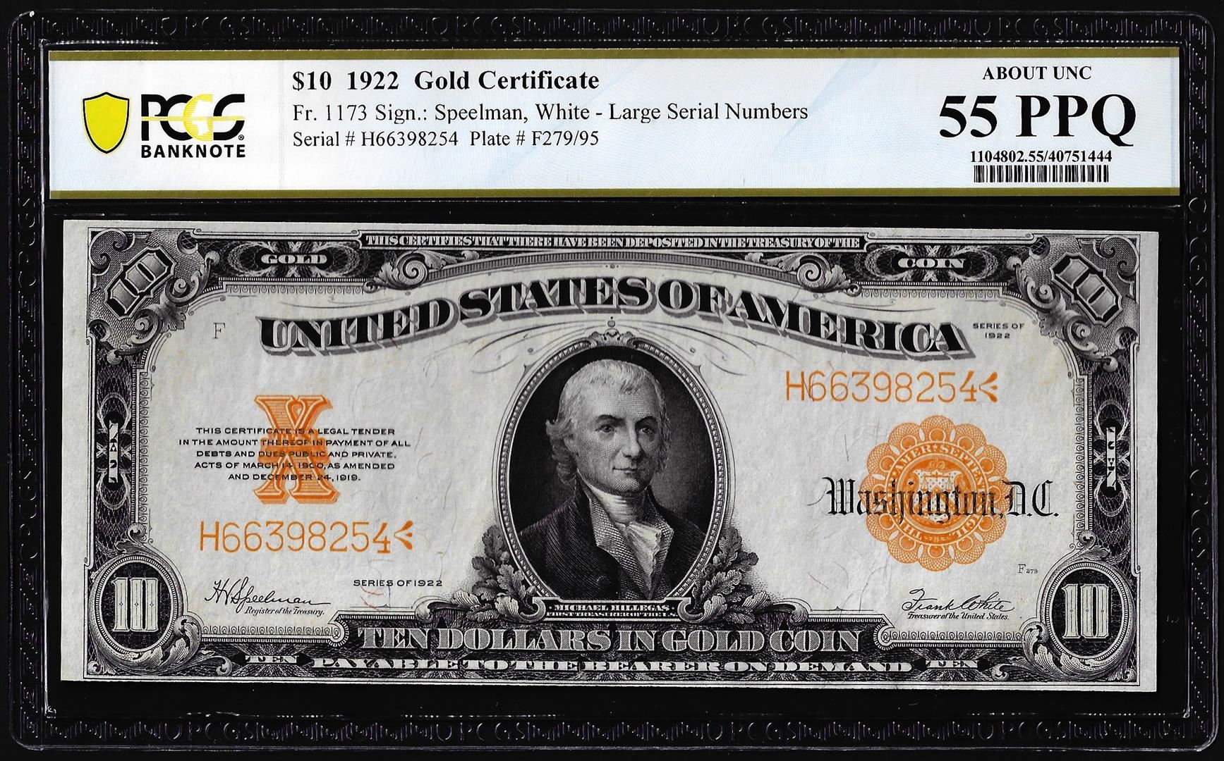 1922 $10 Gold Certificate Note Fr.1173 PCGS About Uncirculated 55PPQ