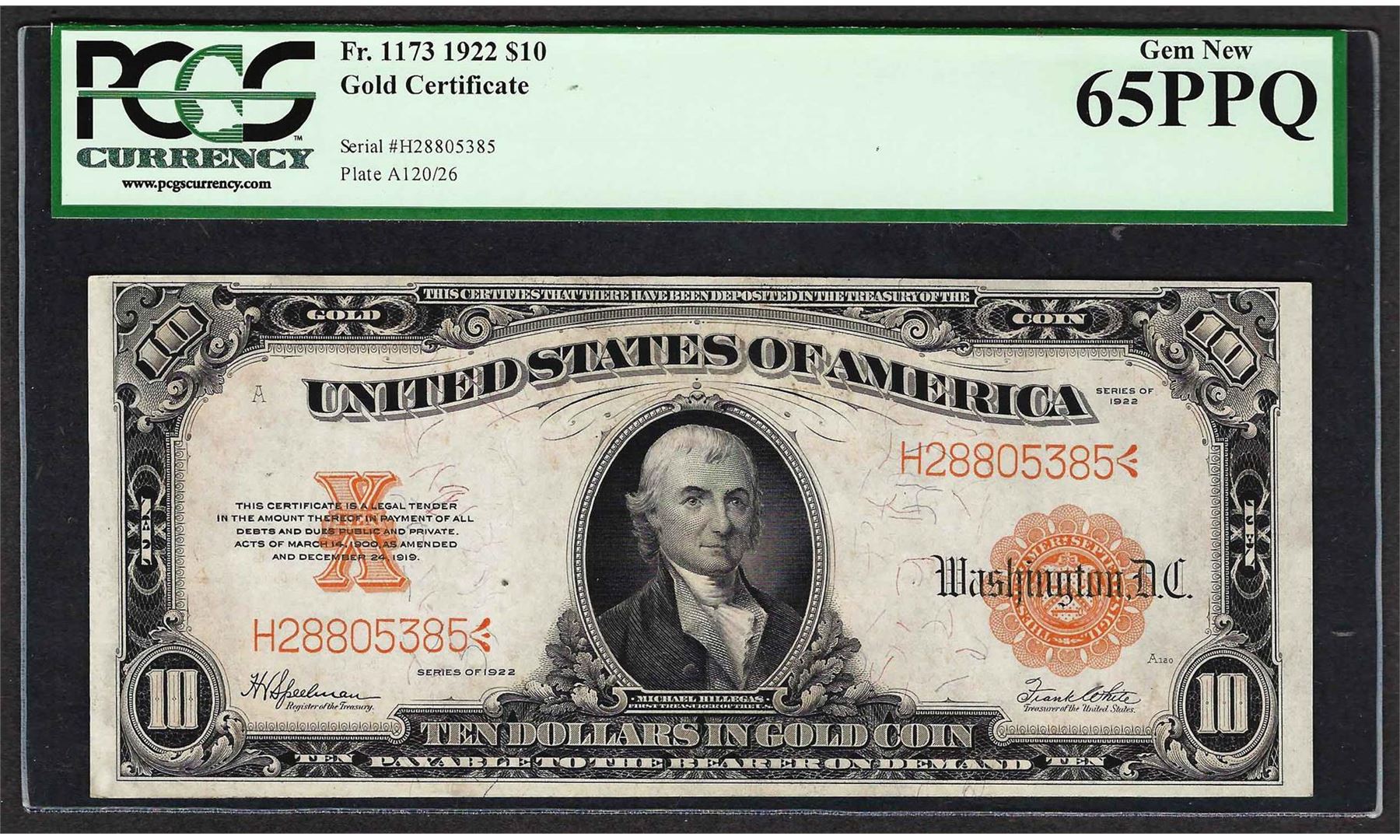 One 1922 $10 Gold Certificate Note Fr.1173 PCGS Gem New 65PPQ. PCGS Graded.