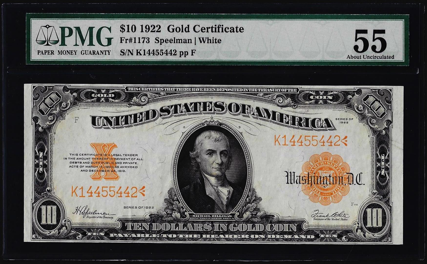 One 1922 $10 Gold Certificate Note Fr.1173 PMG About Uncirculated 55. PMG Certified.
