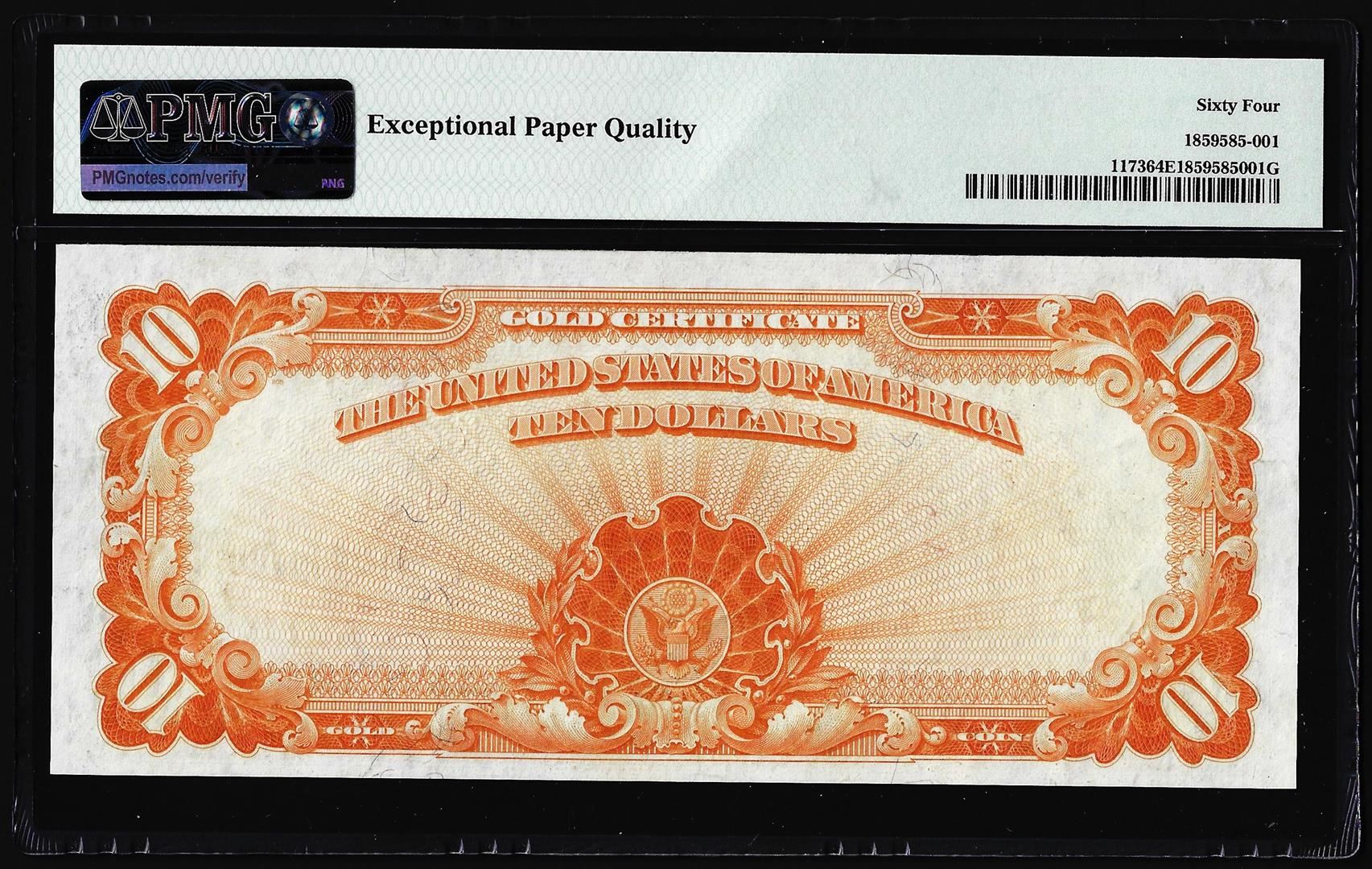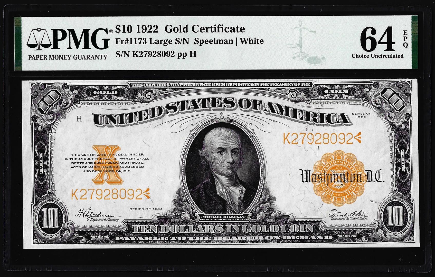 One 1922 $10 Gold Certificate Note Fr.1173 PMG Choice Uncirculated 64EPQ. PMG Certified.
