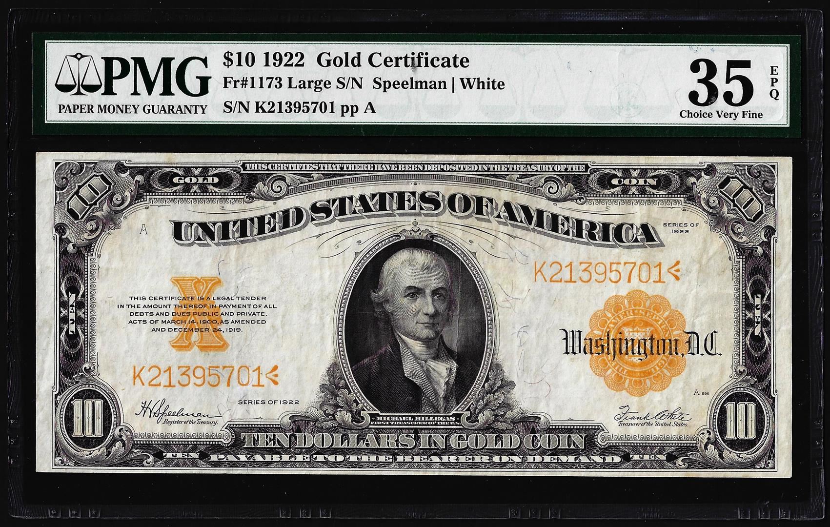One 1922 $10 Gold Certificate Note Fr.1173 PMG Choice Very Fine 35EPQ. PMG Certified.