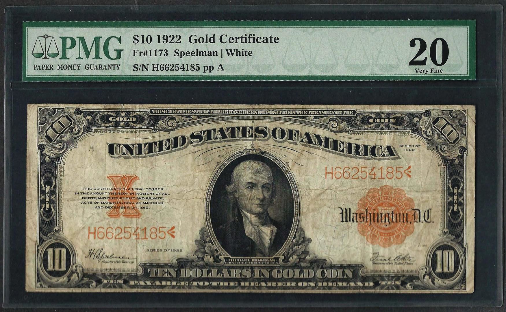 One 1922 $10 Gold Certificate Note Fr.1173 PMG Very Fine 20. PMG Certified.