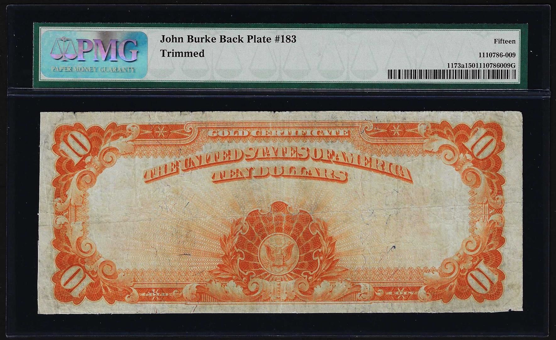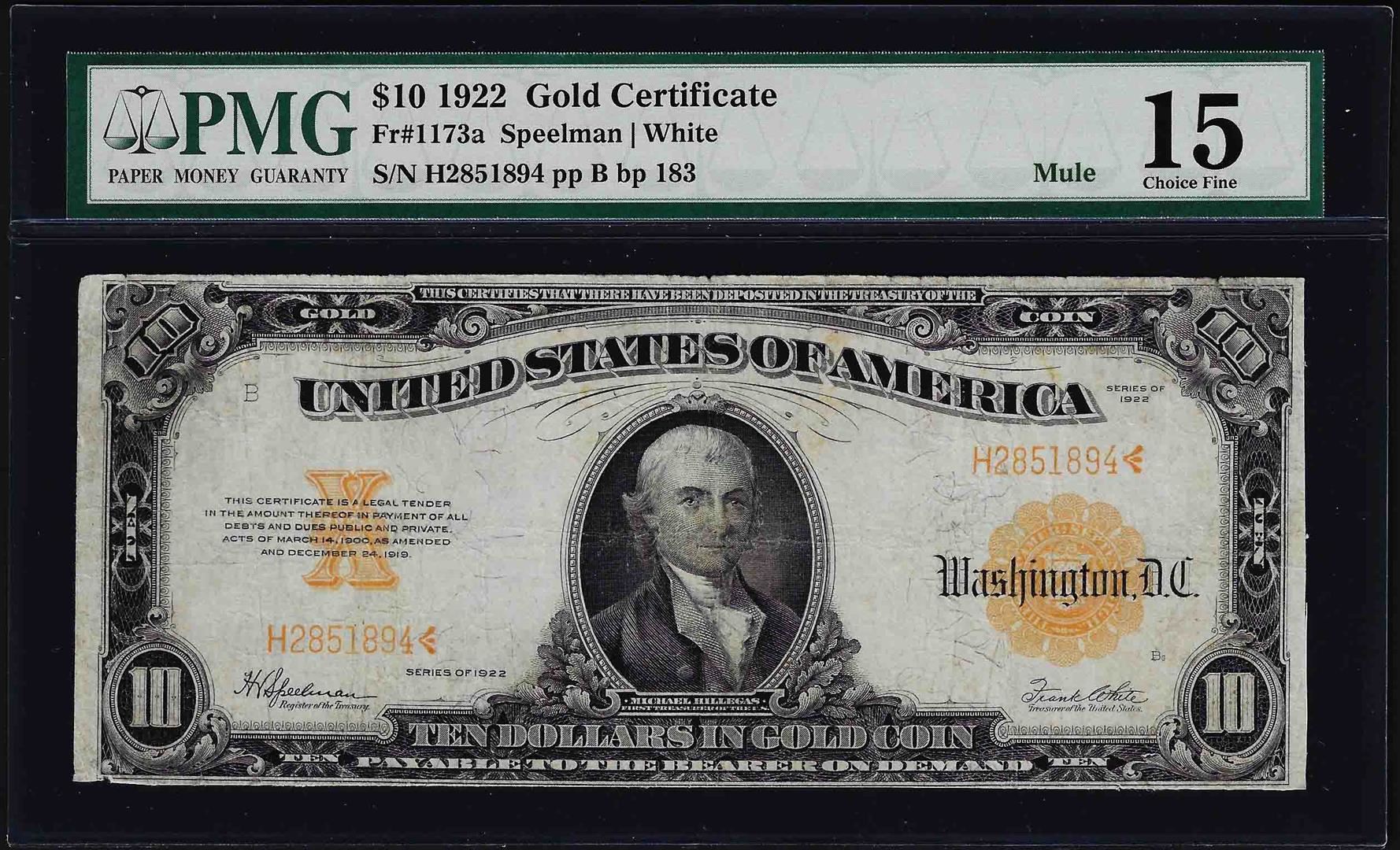 One 1922 $10 Gold Certificate Note Mule PMG Choice Fine 15. PMG Certified.