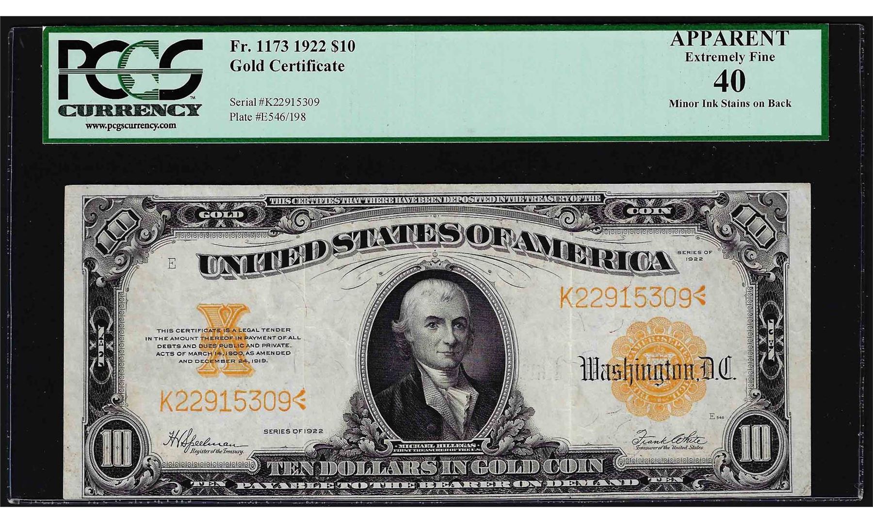 One 1922 $10 Gold Certificate Note PCGS Extremely Fine 40 Apparent. PCGS Graded.