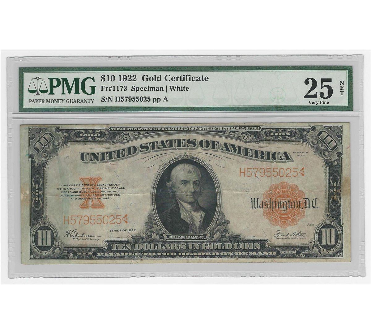One 1922 $10 Gold Certificate Note PMG VF25. PMG Certified.