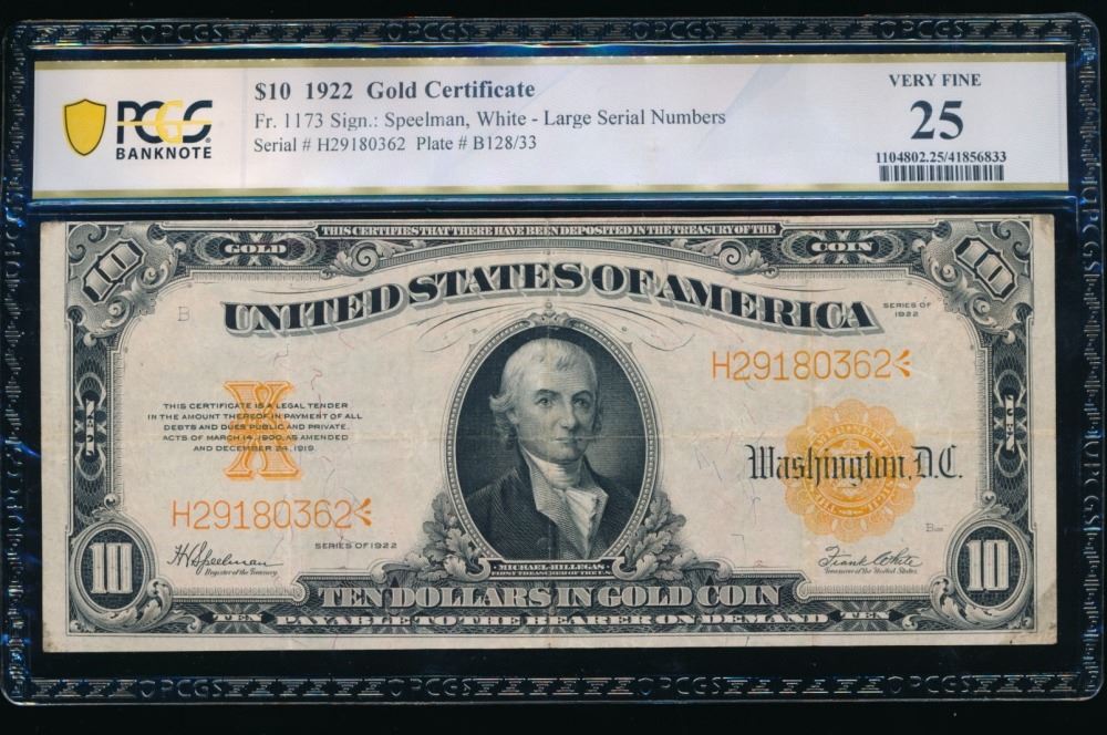 One 1922 $10 Gold Certificate PCGS 25.