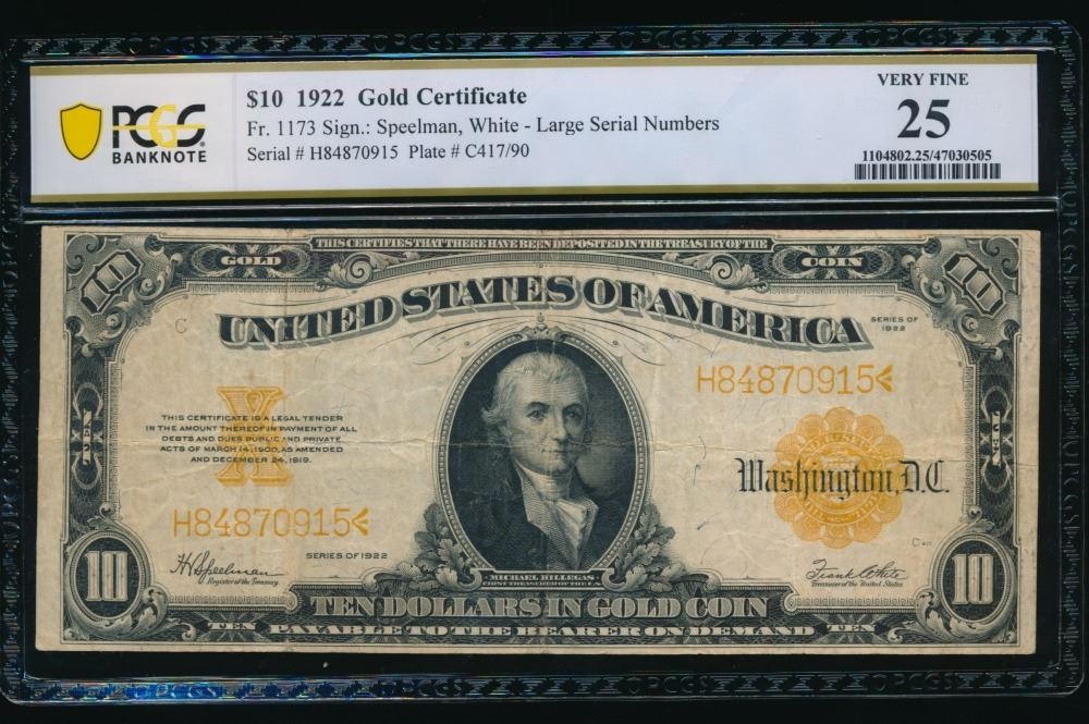 One 1922 $10 Gold Certificate PCGS 25.