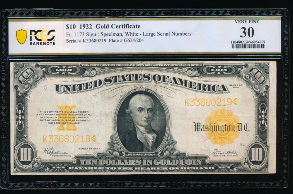 One 1922 $10 Gold Certificate PCGS 30.