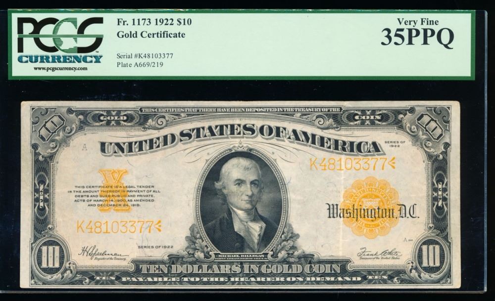 One 1922 $10 Gold Certificate PCGS 35.