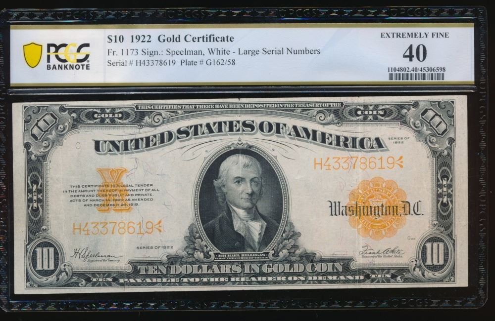 One 1922 $10 Gold Certificate PCGS 40.