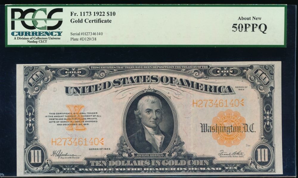One 1922 $10 Gold Certificate PCGS 50PPQ.