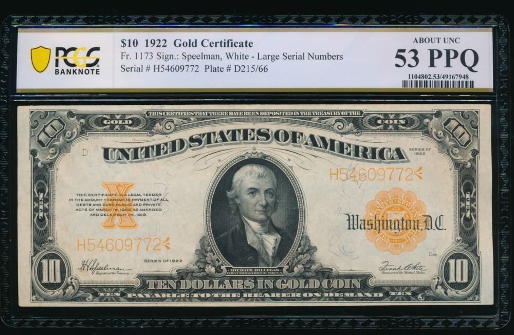 One 1922 $10 Gold Certificate PCGS 53PPQ.