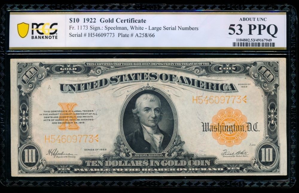 One 1922 $10 Gold Certificate PCGS 53PPQ.