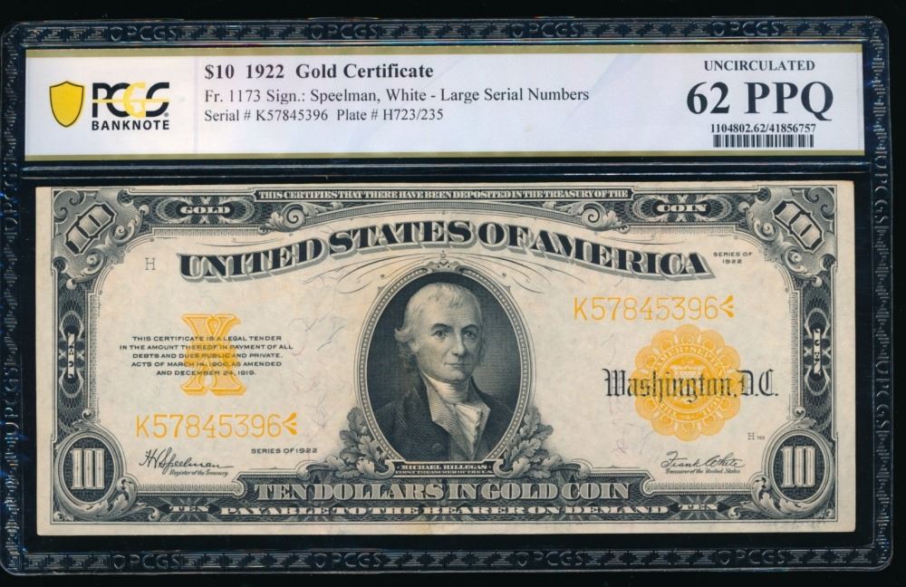 One 1922 $10 Gold Certificate PCGS 62PPQ.