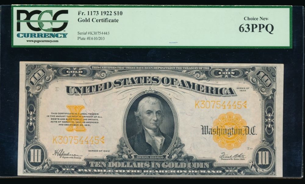 One 1922 $10 Gold Certificate PCGS 63PPQ.
