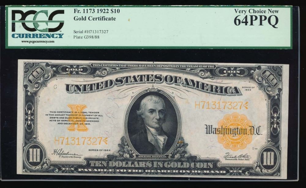 One 1922 $10 Gold Certificate PCGS 64PPQ.