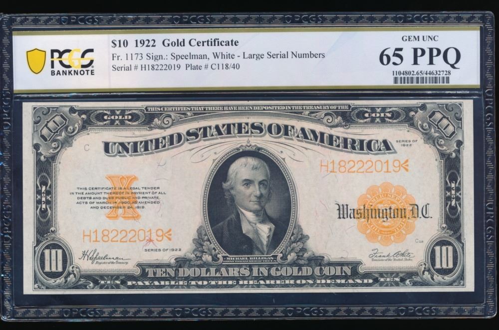 One 1922 $10 Gold Certificate PCGS 65PPQ.