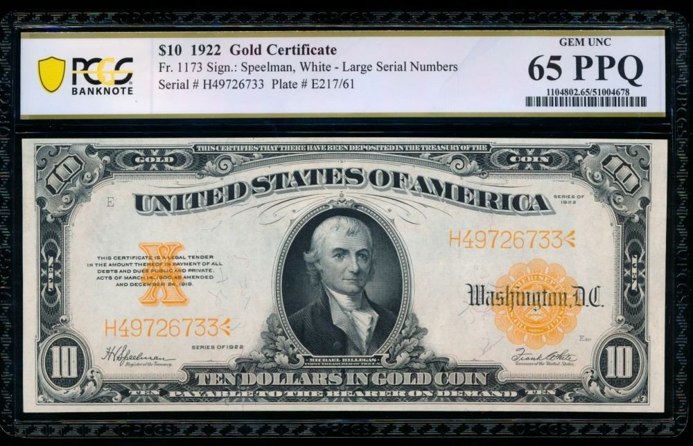One 1922 $10 Gold Certificate PCGS 65PPQ.