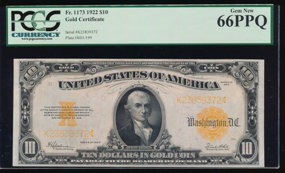 One 1922 $10 Gold Certificate PCGS 66PPQ.