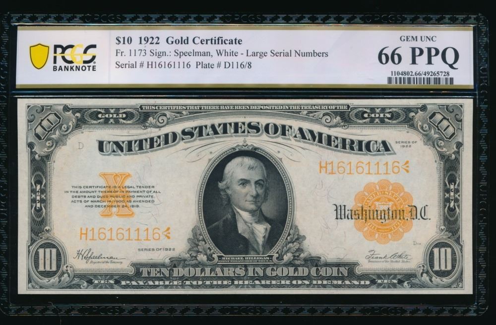 One 1922 $10 Gold Certificate PCGS 66PPQ.
