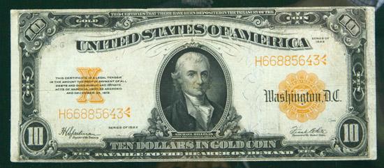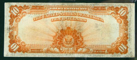 1922, $10 Gold Certificate. PCGS Apparent Very Fine 25. . Fr-1173. PCGS Currency has noted a small edge tear and damage at the top left, as well as some staining on the back.