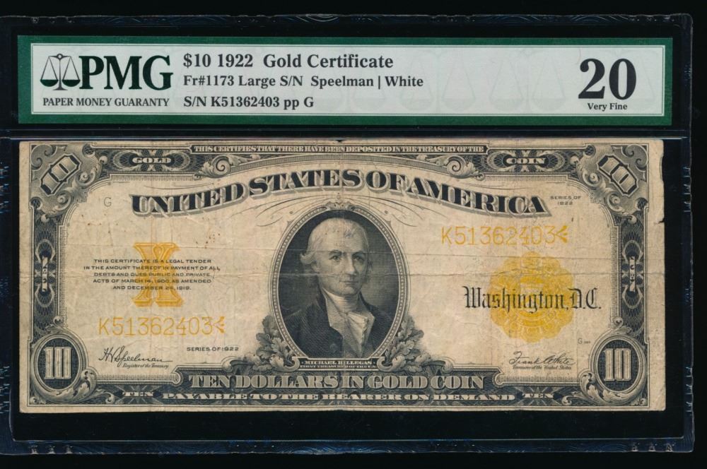One 1922 $10 Gold Certificate PMG 20.