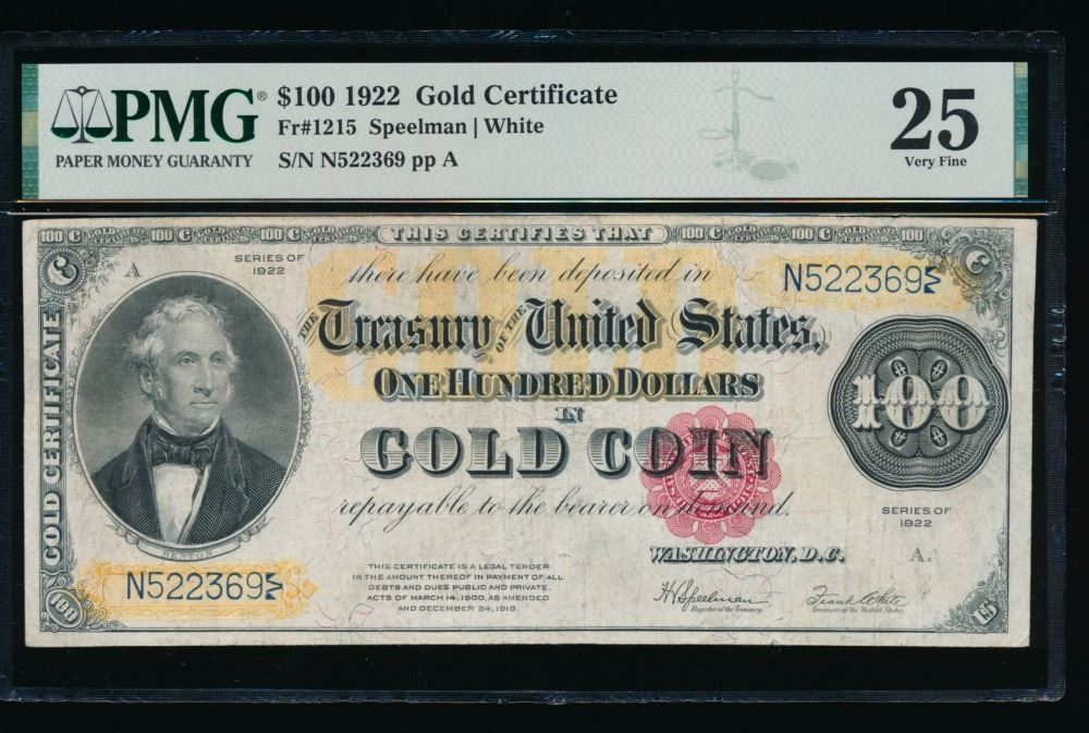 One 1922 $10 Gold Certificate PMG 25.