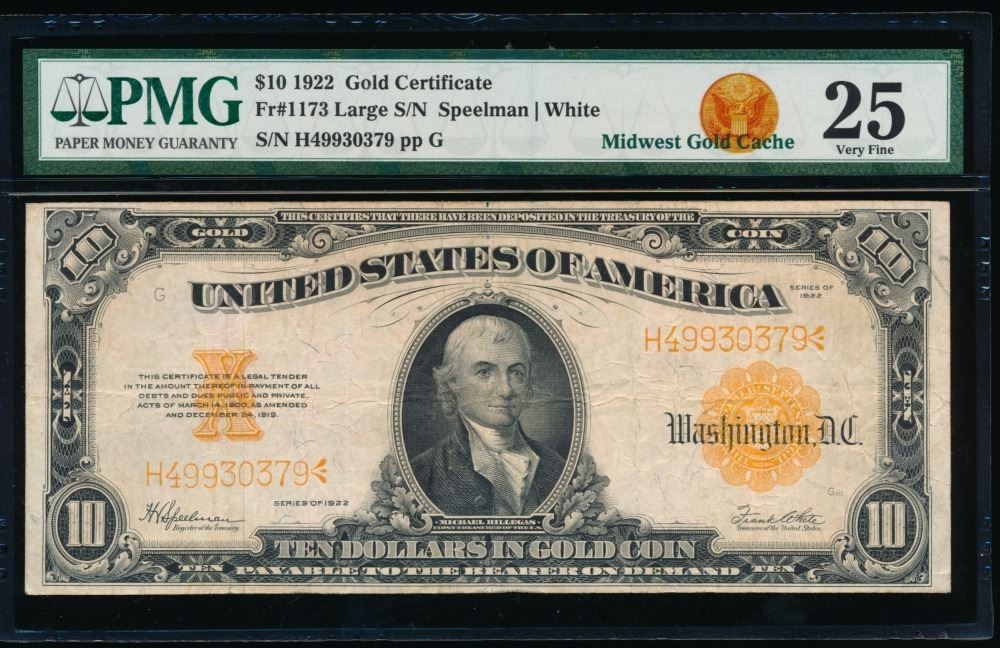 One 1922 $10 Gold Certificate PMG 25.