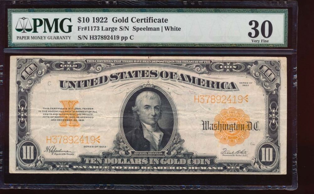 One 1922 $10 Gold Certificate PMG 30.