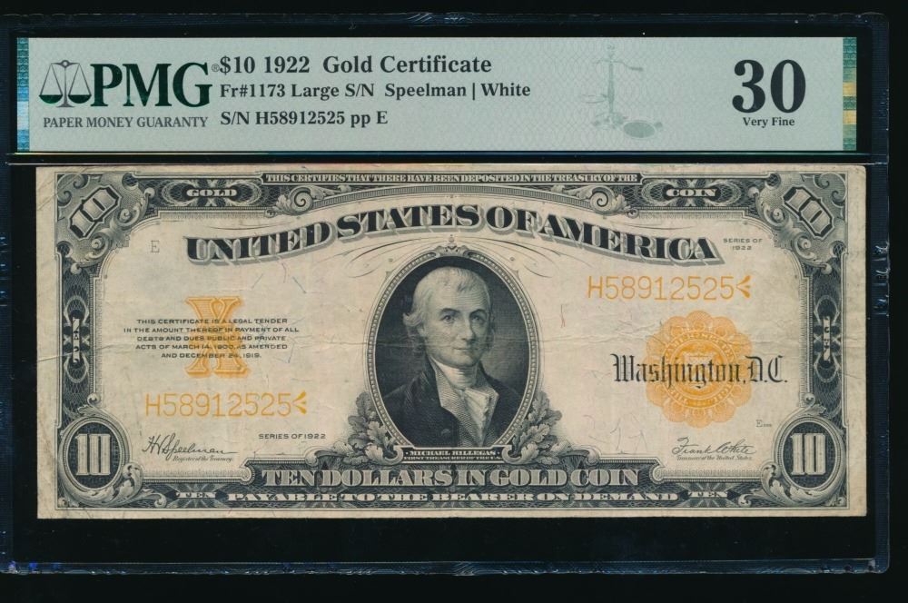 One 1922 $10 Gold Certificate PMG 30.