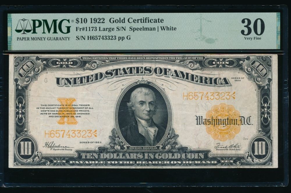 One 1922 $10 Gold Certificate PMG 30.